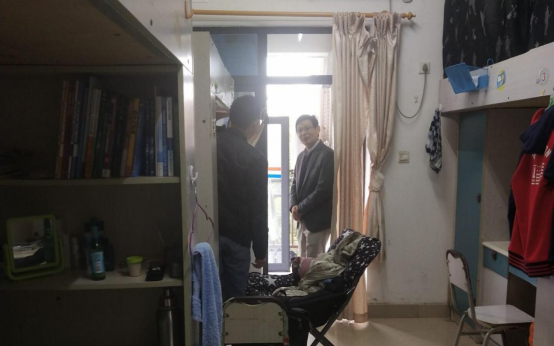 检查小组首先对大二的寝室进行了检查,大二学生学习生活用品较多,许多学生自主贴上了墙纸,购买了许多收纳的小物件,各类物品较多,大多数寝室卫生比较整洁,未发现大功率电器。在检查过程中,余涛老师对同学们寝室漏水、墙壁泛黄、热水器使用等生活情况进行了详细了解,并担心这些问题会给学生在冬天正常生活造成困扰,建议寝室成员打电话给维修人员,尽早解决问题。