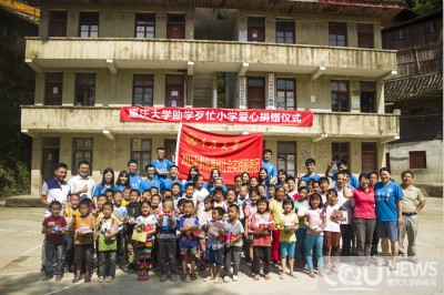 13日上午九时许,志愿者们满载物资,历经16个小时的路途奔波,在台江团县委、县妇联、县投资促进局、方召乡的陪同下,终于抵达本次志愿服务对象——贵州省台江县方召乡向阳村歹忙小学。经过简短准备后,服务团便开展了“重庆大学助学歹忙小学捐赠仪式”。志愿者们向留守儿童捐献了工具书、课外读物、书包、篮球等文体用品。
