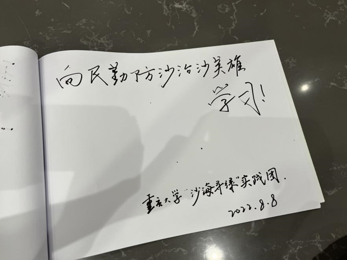 参观结束后,实践团成员们在留言册上写下“向民勤防沙治沙英雄学习!”的字样,以此来表达对民勤县人民实现治沙传奇的敬佩。