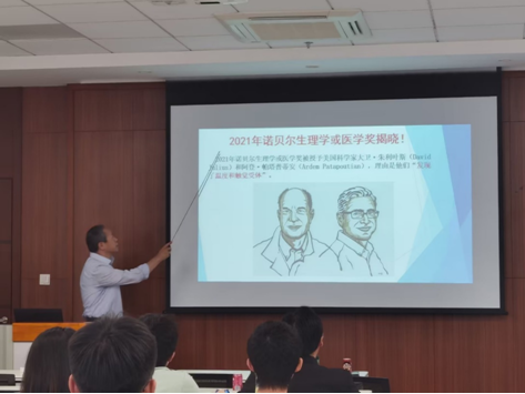 报告开场,戴吉岩教授以幽默风趣的话语向学生们讲述了21年诺贝尔生理学或医学奖的项目原理。进而讲述了老师自己的课题:智能材料。