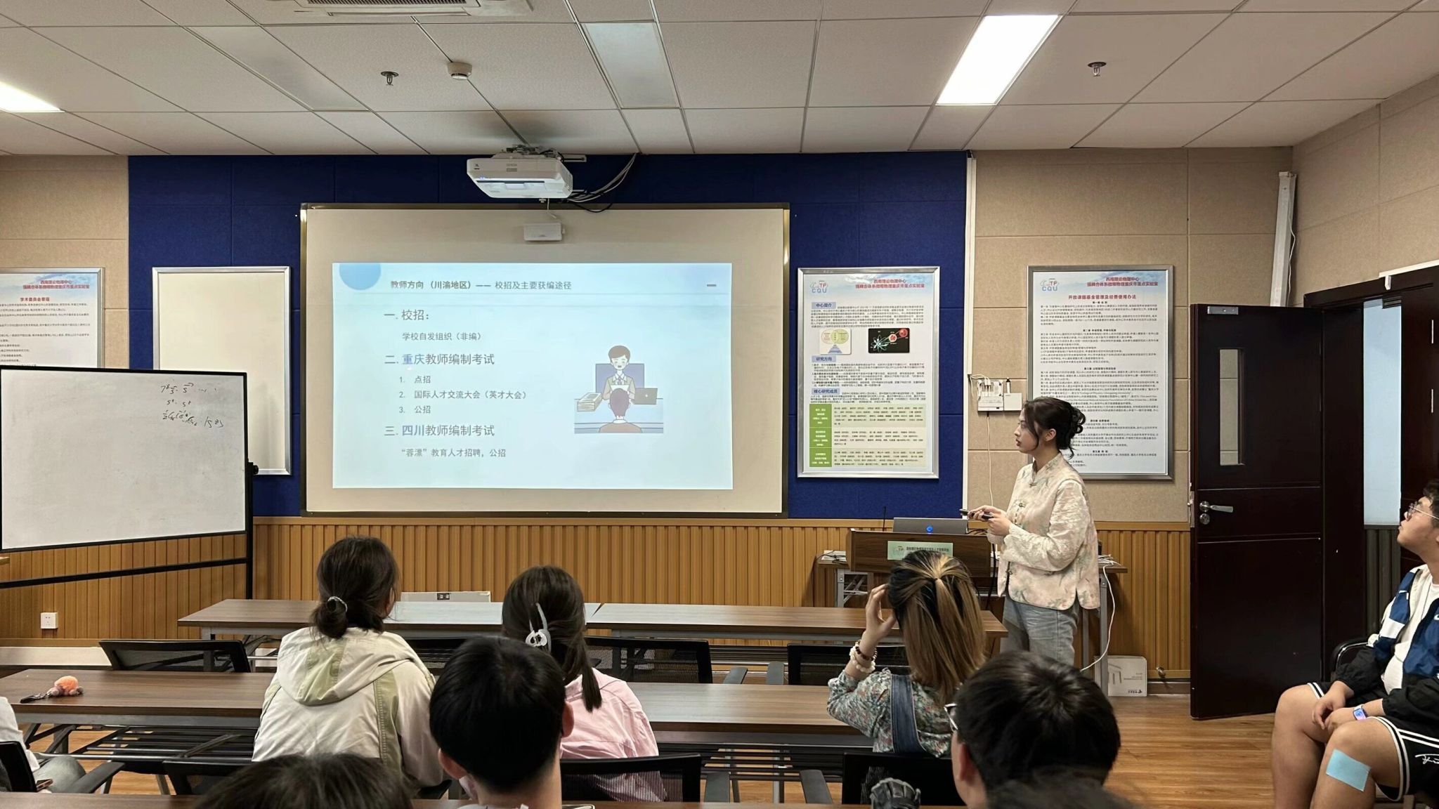 接着,陈鑫彤硕士研究生为大家介绍了中学方向的就业情况。她分别就校招、重庆教师编制考试、四川教师编制考试详细阐述了成为一名优秀中学物理教师的必备素质和能力:扎实的专业知识、良好的教学能力和与学生沟通的技巧。陈鑫彤还分享了自己在教学实践中的心得体会,鼓励同学们积极参与教学实习,提升自己的教学实践能力。