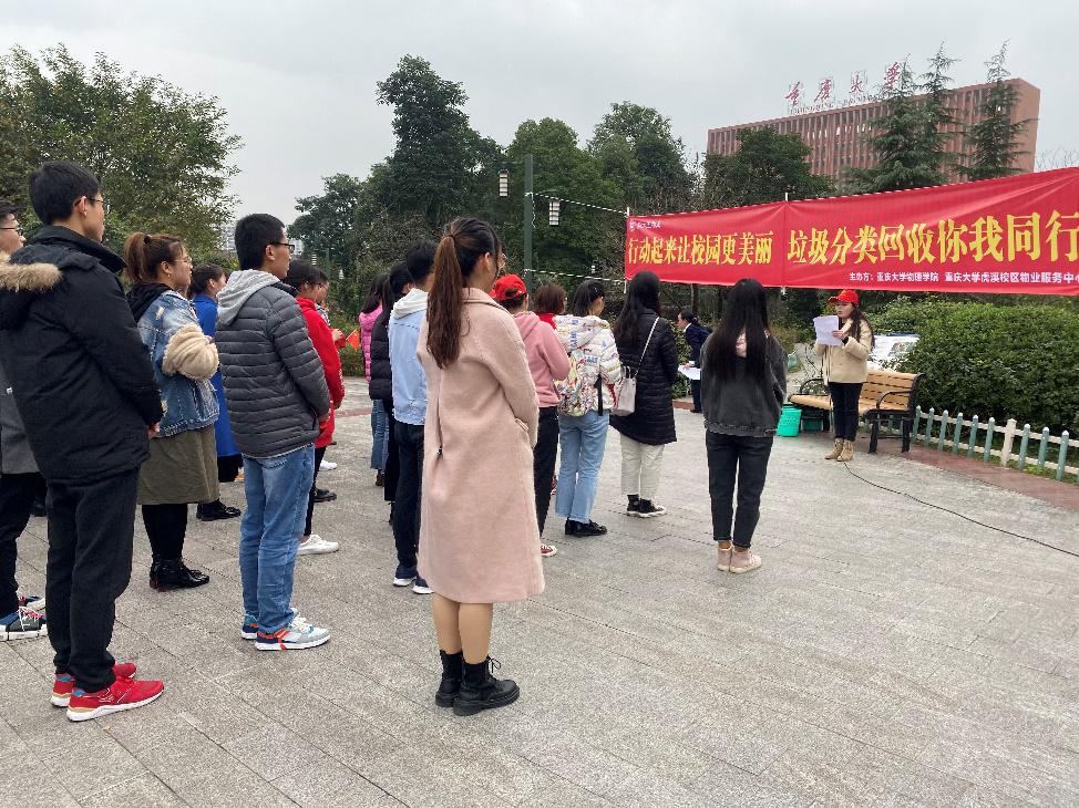 本次活动共分为4个环节:(1)垃圾分类的重要性;(2)垃圾分类小课堂;(3)垃圾分类小游戏,明辨垃圾种类;(4)校园垃圾清理并分类回收。首先,由重庆大学虎溪校区党工委副书记韦迎春韦同志讲解垃圾分类的重要性。随后学生代表邓鑫“就作为高校大学生应该如何实施垃圾分类”发言。其次,重庆大学虎溪校区物业服务中心的老师进行垃圾分类知识讲解,并实物演示,让大家进一步明白可回收垃圾、厨房垃圾、有害垃圾和其他垃圾的分类。然后,学生与物业员工一起进行竞赛模式的垃圾分类小游戏。以游戏形式掌握具体垃圾的分类。大家都表现出极高的热情。最后,学生与员工联合,进行校园垃圾清理,并将垃圾带到指定地点进行分类。活动结束后,大家共同打扫场地并分类回收垃圾。