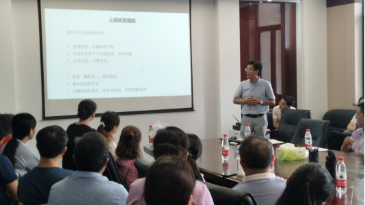 学生学习发展以及校园生活与适应进行了交流。余涛从自己的学生工作经历与经验分别对本科学生素质与能力、学生发展与培养规律、学生专业和家长在大学学生教育中应扮演的角色等问题进行了分享,并对新生入校对于人际关系、学习、校园生活、情绪方面的适应进行了分析,为家长们对新生入学适应以及未来能力发展做了建议,以此为新生家长们助力新生进行学习提供自己的方法。