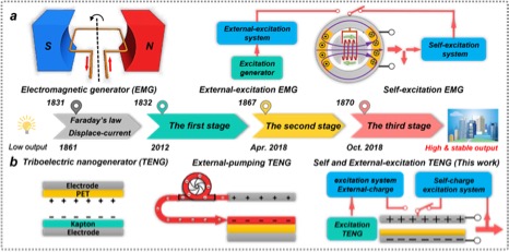 类似于传统的励磁发电机,该论文报道了结合倍压电路开发了完整的外电荷激励TENG和自电荷激励TEGN,通过结构设计实现了激励电荷直接储存在电极上并得到了1.25mC/m2的大面电荷密度。同时,相比于外电荷泵浦方法,自电荷激励模式下实现了10倍的电荷注入速度提升,并且去掉了泵浦TENG部分从而得到了更为简单的TENG结构。展示了自电荷激励TEGN在扩展TEGN实际应用中的巨大潜在价值。通过研究电磁发电机的发展历史,自电荷激励TEGN的实现也展现了TEGN在大尺寸、高电压发电应用方面的潜在可能。