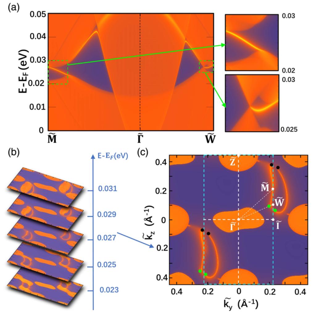 图2. 铁磁氧化物RbCr4O8中的孪生Weyl费米子激发及Fermi弧表面态.