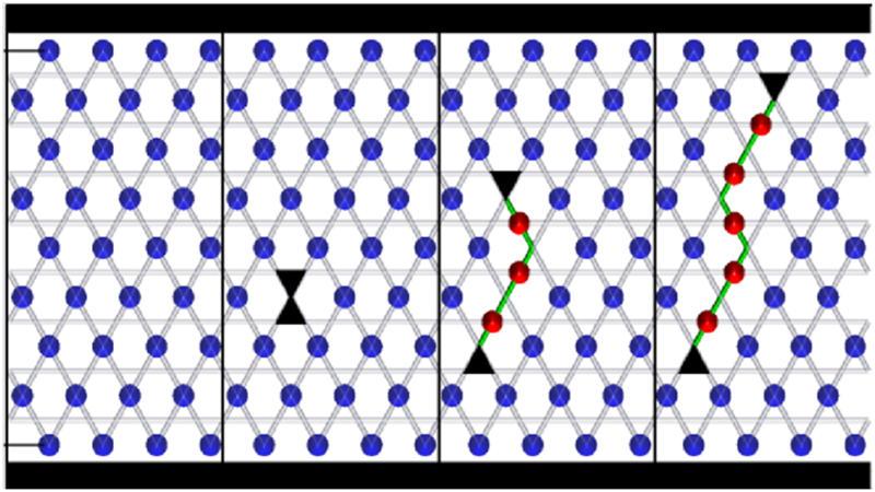 粒子一般带有整数化电荷,然而由于几何阻挫(Frustration)和量子涨落的共同作用,如图2所示,系统会出现分数化粒子(黑色上下三角)激发以及弦形式(绿线)的拓扑激发。神奇的是,分数化粒子可以映射为磁单极子,量子弦激发则映射为磁场线,从而系统的有效理论为描述两种不同类型磁单极子的格点规范场论。根据有效理论,此类量子拓扑激发有可能会导致相变超越朗道范式的描述,从而具有许多新奇的现象。张学锋研究组通过大规模量子蒙特卡洛数值方法模拟了约15000个量子自旋,发现在Kagome晶格中由共价键固体态到超流态正是经历了easy-plane NCCP1 类型的退禁闭量子拓扑相变。审稿人评价模拟计算结果达到了世界顶级水平,文章在预印本文库时已经受到麻省理工大学,哈佛大学和中国院物理所等国内外顶级高校研究所的广泛关注。此发现将为量子拓扑相变和拓扑激发提供新的研究平台,从而更进一步拓展人们对于量子拓扑性的认识。