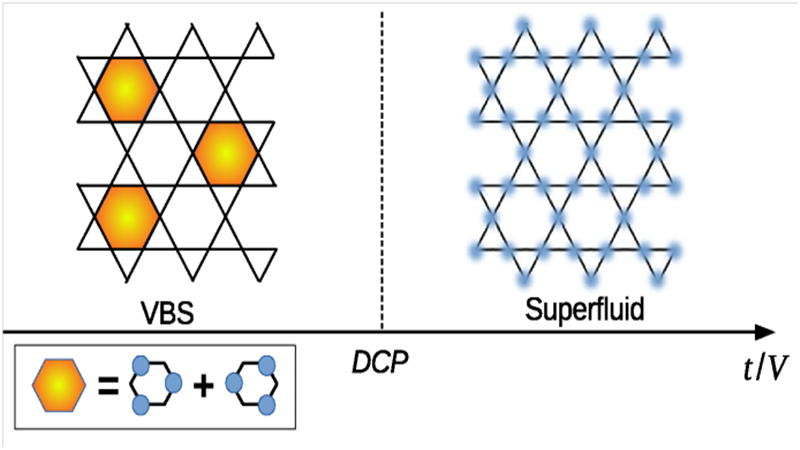 图1:通过调节量子涨落,实现从共价键固体态(VBS)到超流态(Superfluid)的相变,其相变类型属于easy-plane NCCP1 类型的退禁闭相变(Deconfined phase transition);图2:在相边界附近通过调节边界可以观测到分数化粒子激发和量子拓扑弦激发。