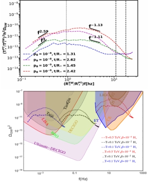 图2:左上:电弱一阶相变产生的磁场能谱;左下:磁场后期演化预言的现在的磁场强度和关联尺度;右上:相变预言的引力波能量谱;右下:预言的引力波有机会被多种探测器观测到