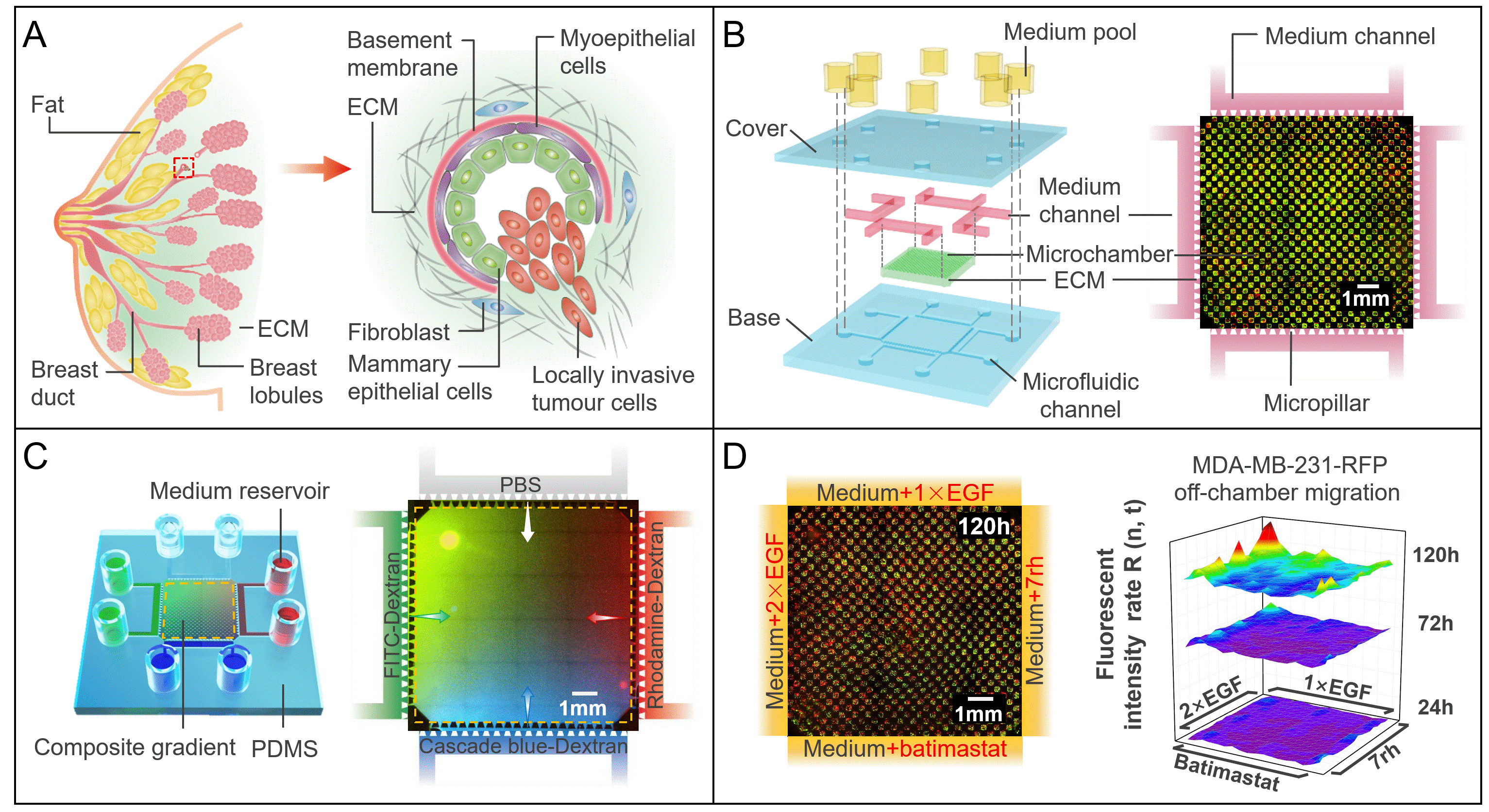 乳腺癌转移是一个复杂的过程,受多种因素调控,包括各种细胞-细胞相互作用、细胞-环境耦合以及氧气、营养和药物梯度等,这些因素与乳腺组织结构的异质性密切相关。在该研究中,设计并构建了一种基于微腔阵列和复合细胞外基质的高通量微流控系统来模拟乳腺癌结构和周围微环境并定量研究乳腺癌细胞的转移。由于其独特的设计,可以利用细胞外基质建立复杂的生化梯度,通过控制整个芯片的稳定梯度,每个微腔将会处于不同浓度的生化微环境。这种设计允许每个微腔的细胞处于独特的生物化学条件下,这可能会诱发不同的细胞行为和生理现象。结合显微镜成像和免疫荧光分析,该生物芯片系统在细胞-细胞和细胞-微环境相互作用及其对癌细胞迁移的影响的量化分析方面具有巨大的潜力。分析结果表明,本研究的装置可以在体外高效模拟乳腺癌结构以及其周围的生化微环境,定量研究单个或复合药物的作用。