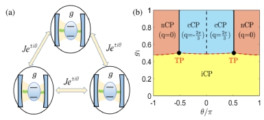 最近,重庆大学张瑜瑜副教授,胡自翔研究员,张学锋研究员,与中物院研究生院傅立斌教授,兰州大学罗洪刚教授,美国Rice University浦晗教授,提出了量子拉比三角模型作为合成规范场的最小单元,首次研究了人工磁场诱导的光子跃迁所产生的新量子相。该工作在原子频率极限下给出了系统的严格解析解,发现了弱耦合的非相干量子相(iCP),和强耦合下光子流的手性相干相(cCP)和正常相干相(nCP),前者破坏了Z2 和手性对称性,后者破坏了Z2 对称性。研究表明,人工规范场可调制光子流运动的方向性,诱导cCP到nCP的一级量子相变;而iCP到两种相干相的变化属于二级量子相变,准确计算其临界指数,与Dicke模型超辐射相变属于相同的普适类。 该工作不仅可模拟人工规范场下二维光与原子强耦合多体系统以及冷原子系统的许多物理现象,而且将来可以应用到量子计算模拟研究中。