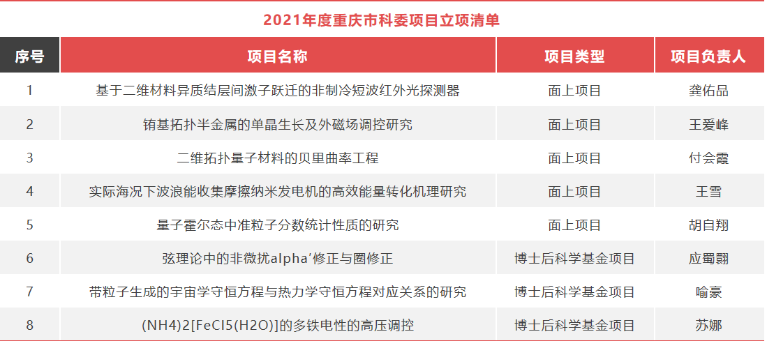 近日,重庆市科技局发布了《2021年度重庆市自然科学基金专项拟立项清单公示》,幸运飞艇 立项重庆市自然科学基金面上项目5项、博士后科学基金项目3项(见附表)。据悉,重庆大学共立项2021年度重庆市自然科学基金面上项目106项、博士后科学基金项目46项。