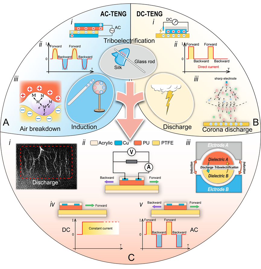 图示:DF-TENG的设计理念:A) 摩擦起电和静电感应耦合实现了传统AC-TENG; B) 摩擦起电和静电放电耦合实现了传统DC-TENG;C) 协同利用摩擦起电、静电放电和静电感应实现了AC/ DC可切换输出模型—DF-TENG。