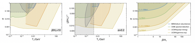 图例:曲率扰动的不同观测实验对相变强度(α),相变速率(β/H*),和相变温度(T*)的限制。左图和中图里灰色实线和灰色点虚线为通过引力波探测实验(PPTA)和原初核合成对相变参数空间的限制。