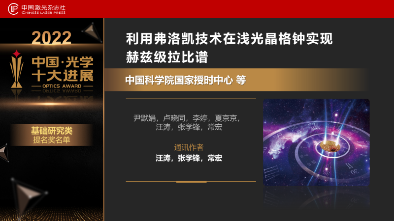 汪涛,张学锋研究团队和国家授时中心“巴渝学者”常宏研究团队合作的“首次实现非重力压制下的锶原子浅光晶格赫兹窄谱”工作荣获“2022中国光学十大进展”提名奖(基础研究类)。该工作是国际上首次利用弗洛凯技术在锶原子浅光晶格钟平台上将kHz的谱线压窄到Hz级别。该实验不仅为量子精密测量提供了新的思路,也向空间载星载光钟迈出了重要的一步。