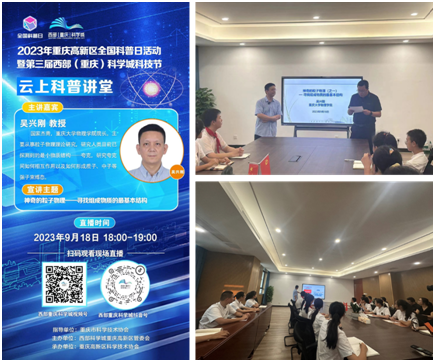 吴兴刚教授受邀走进四川外国语大学重庆科学城中学,给同学们带了《神奇的粒子物理--认识组成物质的最基本结构》的科普报告。吴兴刚教授从老一辈物理学家的爱国精神出发,鼓励同学们努力学习,报效祖国。报告中,吴兴刚教授通过“我们从哪里来,到哪里去,又如何构成?”等问题出发,引导同学们去认识组成微观世界的基本物质结构。吴兴刚教授在报告中讲到,好奇心是支撑粒子物理发展的强劲动力,大胆想象、小心求证,让未知成已知,精彩而又神奇的微观物质世界等你去揭秘。