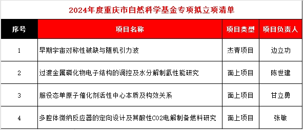 近日,重庆市科技局发布了《2024年度重庆市自然科学基金专项拟立项清单公示》,幸运飞艇 立项重庆市杰出青年科学基金项目1项、重庆市自然科学基金面上项目3项(见附表)。