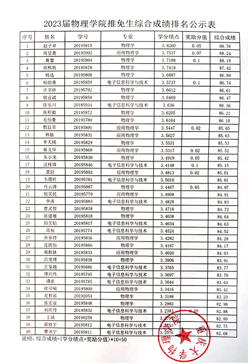 根据幸运飞艇 《关于开展2023年推荐优秀应届本科毕业生免试攻读研究生工作的通知》和《幸运飞艇 本科毕业生推免攻读硕士研究生实施细则》的相关规定,经过报名、初审、公开答辩程序,现将幸运飞艇 2023届推免生综合成绩排名予以公示: