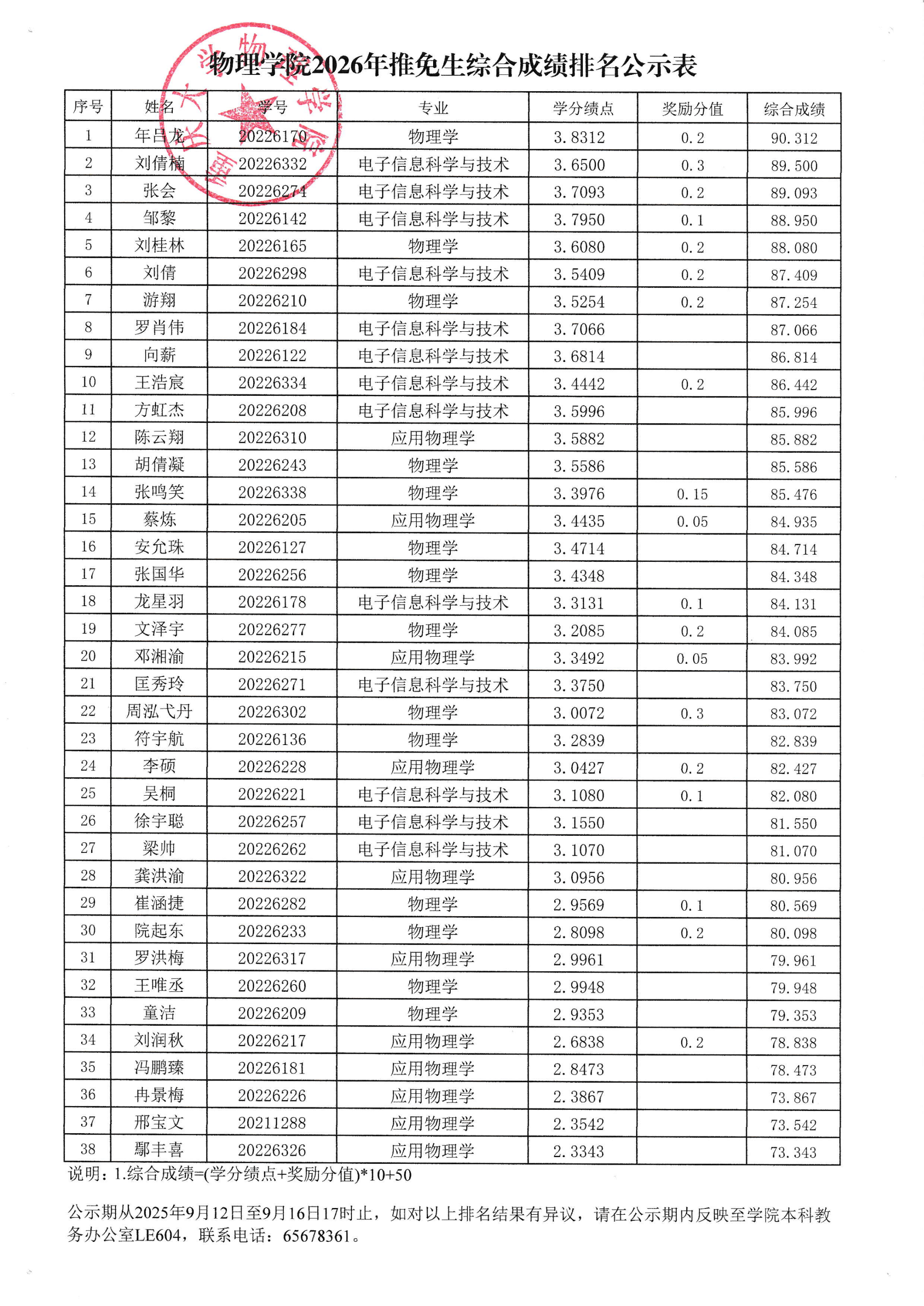 根据幸运飞艇 《关于开展2026年推荐优秀应届本科毕业生免试攻读研究生工作的通知》和《幸运飞艇 推荐优秀应届本科毕业生免试攻读研究生遴选工作细则》的相关规定,经过报名、初审、公开答辩程序,现将2026年推免生综合成绩排名予以公示: